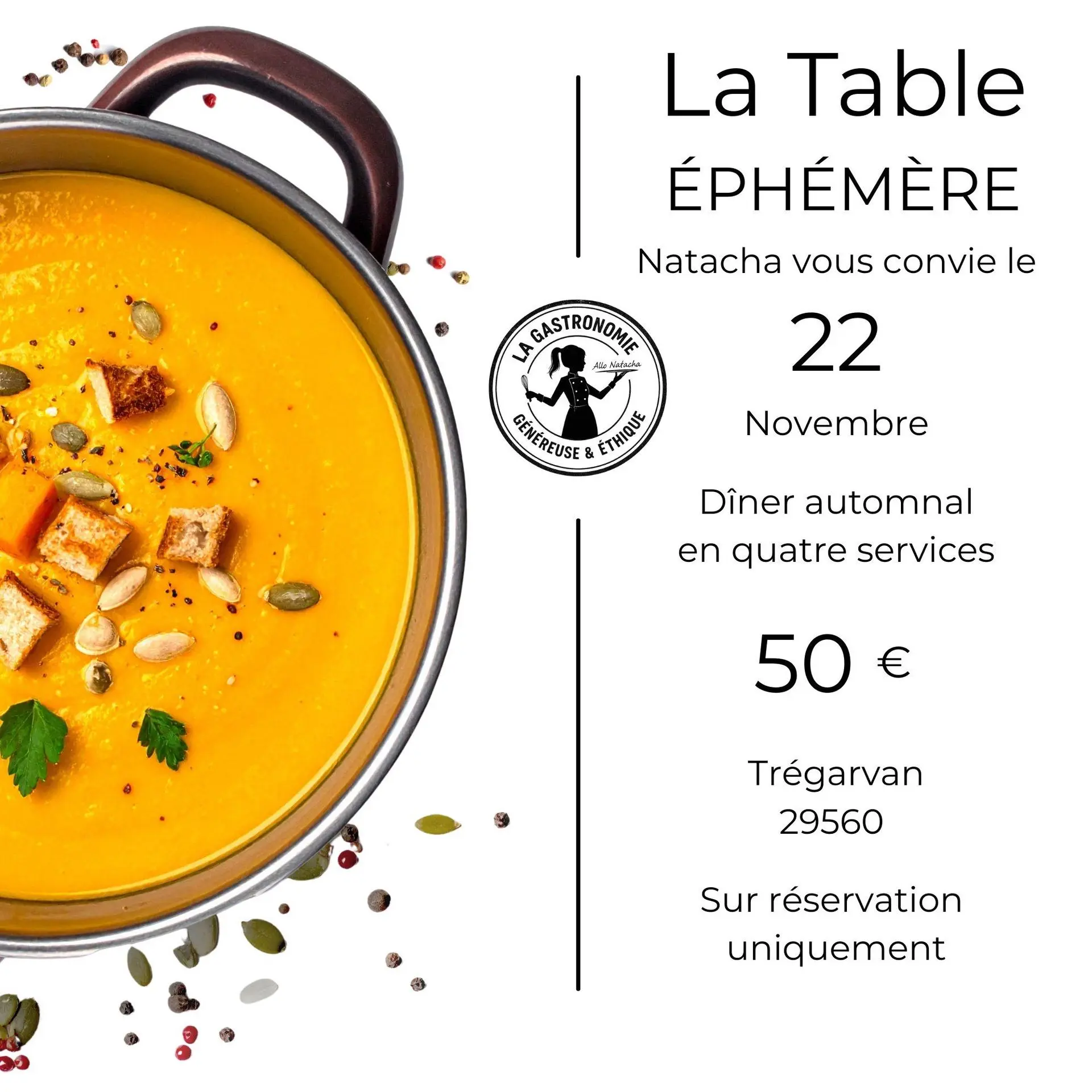 Ouvert à tous, je vous convie à un moment convivial et chaleureux autour de ma table éphémère avec au menu des plats réconfortants préparés à partir des pépites des producteurs locaux !